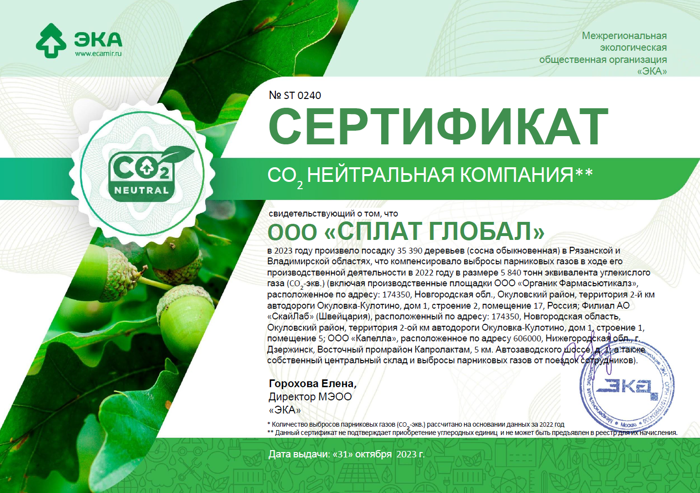 Мы получили сертификат, подтверждающий СО₂-нейтральность компании в 2022 году! Совместно с Межрегиональной экологической общественной организацией «ЭКА» мы высадили 35 390 деревьев сосны обыкновенной. Посадка в Рязанской и Владимирской областях позволила компенсировать 5 840 тонн СО₂-экв., которые произвела наша компания в 2022 году.
